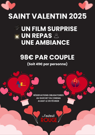 A l'occasion de la Saint Valentin, venez profiter d'une soirée en amoureux dans votre cinéma "Le Fauteuil ROUGE". Installez-vous en salle, on s'occupe du reste : - Un film choisi par notre équipe - Une ambiance tamisée spéciale Saint-Valentin - Un traiteur sur scène - Votre repas servi à votre siège durant toute la durée du film Nos partenaires pour cette Saint Valentin : Bonobo, Duotech, FBM, Piejac Maingret, Poivre et miel, DS AUTO, Les garages Chaigneau, Mon contrôle technique GREG. Tarif unique : 100€ par couple